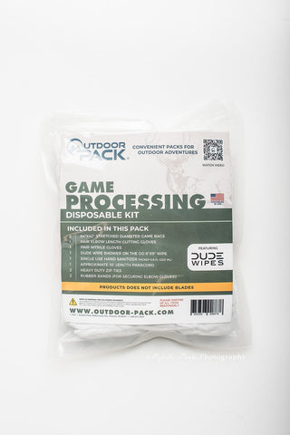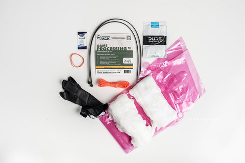Our disposable game processing kits are designed to have everything you need for processing game in the field. This "No Blades" version is designed for individuals who prefer to use a normal, non-interchangeable blade knife. (NOT INCLUDED) This full version of the kit includes two game bags which assist with keeping your meat clean and sanitary for transportation away from the harvest site. Our years of experience have filled this kit with useful products to make your game processing, faster, easier, and more sanitary. Let our Disposable Game Processing Kits assist you with making your next in the field game processing a better experience. The two game bag kits such as this are ideal for medium size game such as Deer. For larger game such as Elk we recommend you purchase our kits that do NOT include game bags (Equivalent of this kit Skew: DGPKNBNOGB), along with our 4x Game Bags Only kit (Skew: EGB) which will allow for adequate game bag space to take care of your larger game animals. PLEASE NOTE THIS KIT HAS NO BLADES INCLUDED.